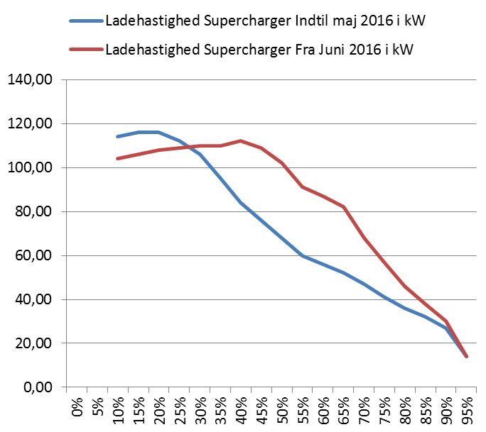 I slutningen af maj 2016 fik min bil et nyt lademønster, hvor dem maksimale effekt var faldet lidt (fra 116 kW til 112 kW). Til gengæld holdt bilen en høj effekt ved en højere ladestand (fx steg effekten fra 68 kW til 102 kW. Se billede nedenfor.