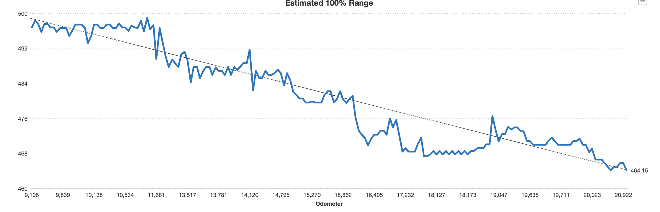 Jeg er også en smule bekymret fro vores M3P mht. batterikapacitet. Den er 8 mdr gammel, har kørt 21.000 km og faldet 7% i kapacitet; fra 499 km til 464 km range ved 100%. Desværre fik jeg først datalogning på fra omkring 9000 km, men fra de 0 til 9000 var der næsten ingen ændring i rated range, de lå omkring de 499 km. Min TeslaFi graf ser således ud